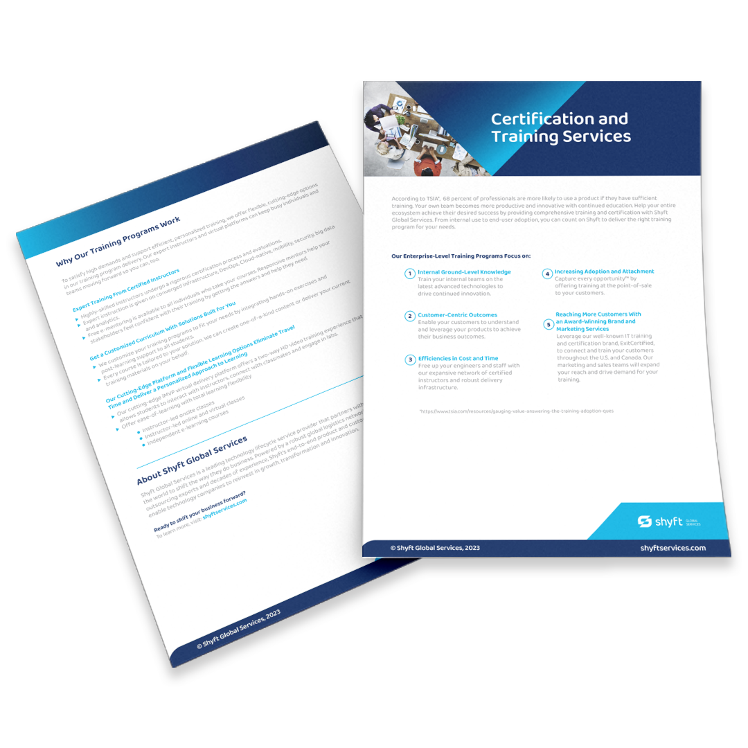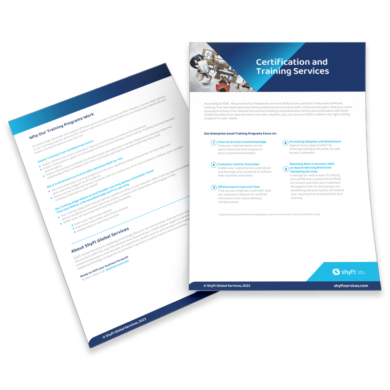 To support your training and certification goals, Shyft offers flexible, innovative training program delivery. From internal use to end-user adoption, we’re at your side every step of the way to ensure training quality and to help your customers maximize the value they get from their technology purchases, faster.