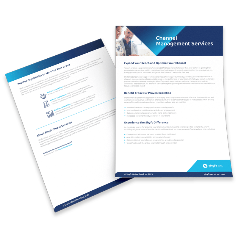 Today’s original equipment manufacturers face more challenges than ever before in getting their products to market. Shyft Global Services helps you make the most of new opportunities by providing a worldwide network of channel-management professionals to serve as the public face of your team. We help you recruit and enable partners, develop revenue strategies, identify growth opportunities and drive customer and partner awareness and retention.