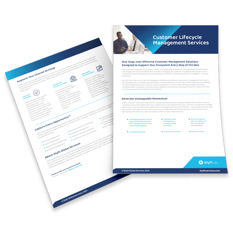 Every customer interaction represents a valuable opportunity for ongoing engagement, traction, revenue retention and growth. Get the most value out of your technology investments by outsourcing customer management services to a trusted partner. As a white-label, distributor-neutral extension of your team, Shyft Global Services delivers the technology lifecycle services you need to expand your channel reach, develop a high-performing, profitable sales ecosystem, promote product adoption and capture every opportunity for revenue.