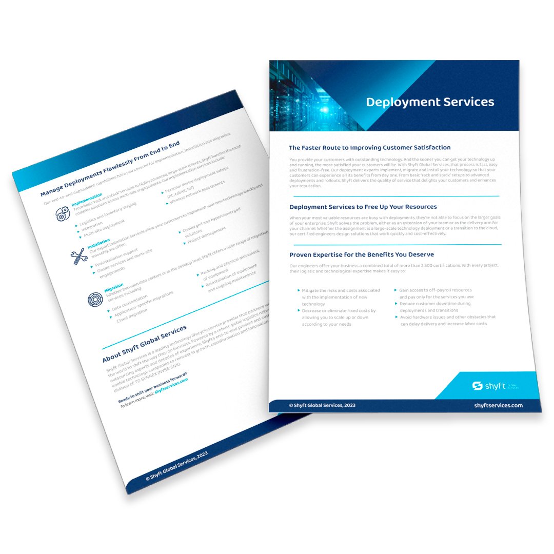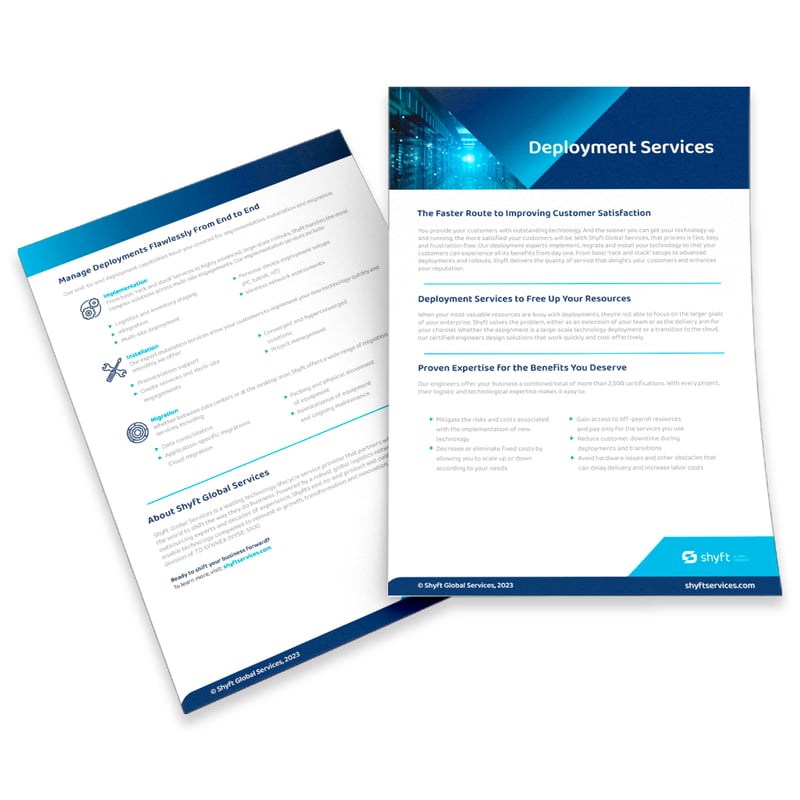 Your customers need to get their systems into production. Shyft Global Services can get them up and running with scalability and an expert team — whether we act as an extension of your team or as the delivery arm of your channel. Our deployment experts implement, migrate and install your technology so that your customers can experience all its benefits from day one. From basic “rack and stack” setups to advanced deployments and rollouts, Shyft delivers the quality of service that delights your customers and enhances your reputation.