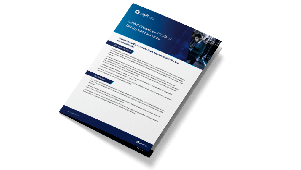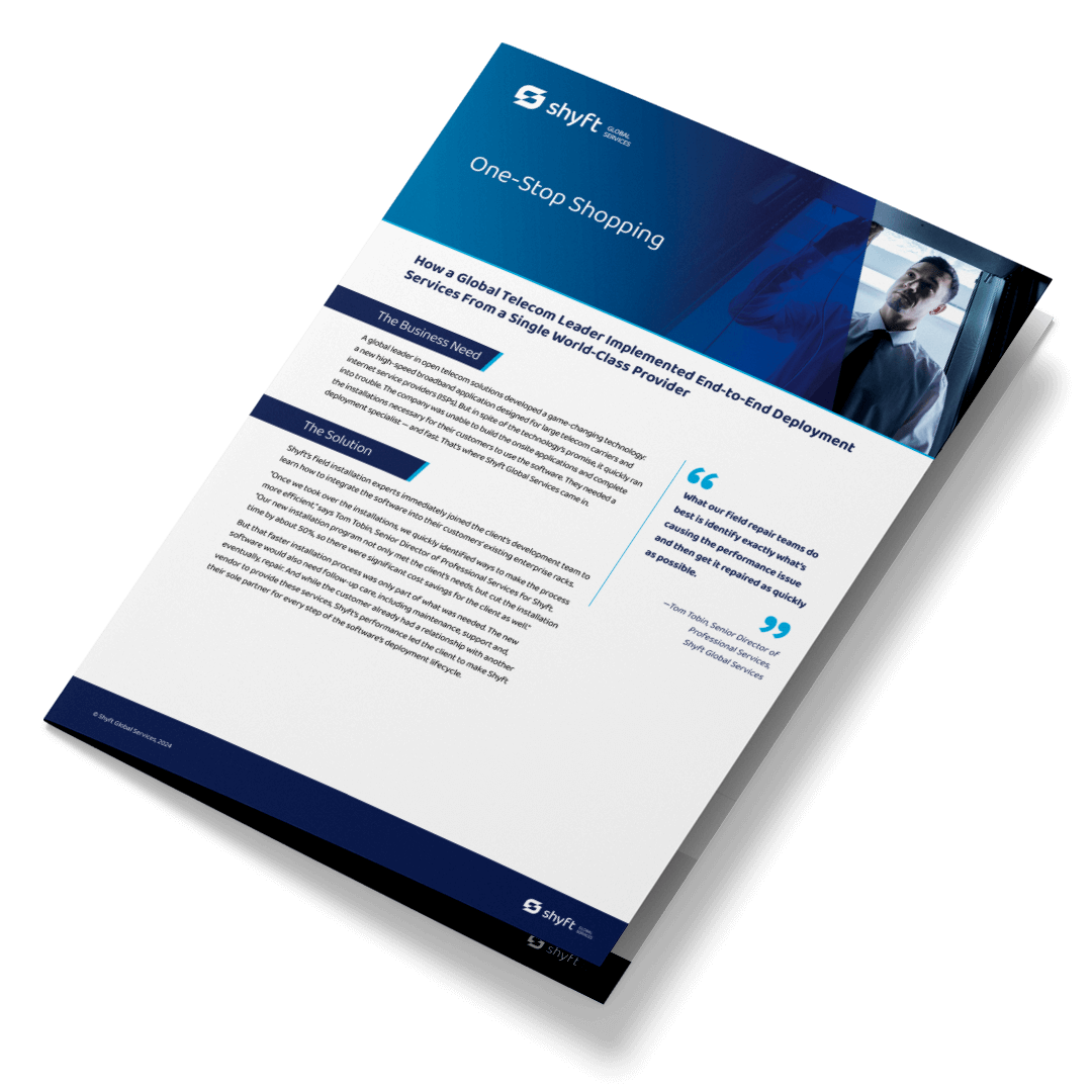 They say it’s not about quantity — it’s about quality. But what if you could have both? When a global leader in telecom services developed game-changing software, they needed help building the onsite applications to deploy it and complete the installations for the enterprise customers to use it. Shyft Global Services' expert installation team stepped in and was able to cut the installation time in half, all while providing follow-up care, maintenance and support. Learn how this global leader teamed up with a world-class partner to get the best quality and quantity of services.