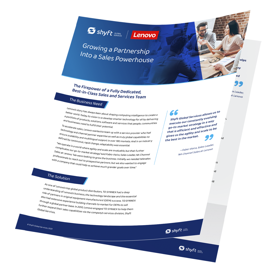 Shyft developed a telesales program with Lenovo in 2010 and the relationship has since grown from its humble beginnings as a 12-person team into a 190+ person powerhouse supported by certified engineers, inside sales specialists, channel development experts, business analytics gurus, customer service professionals, product training and certification leaders, and more.