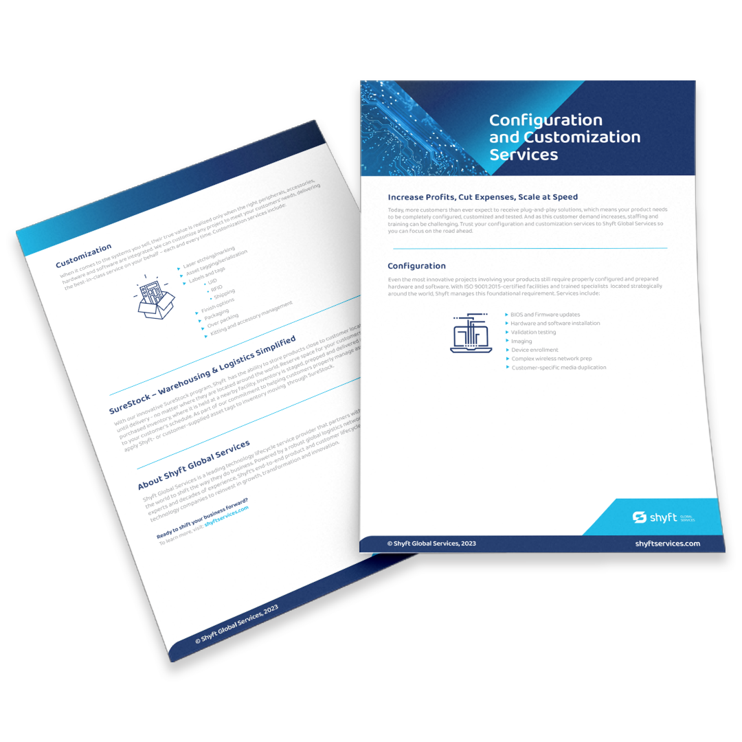 Your customers expect their equipment to arrive ready to plug and play, minimizing down-time and allowing for the seamless operation of their technology. Shyft Global Services' configuration and customization services offer your customers a full array of options to ensure that their IT investment is ready to go, and our SureStock program ensures that the parts your customers need are readily available. Leverage our expertise, free up your time for more vital endeavors and give your customers peace of mind.
